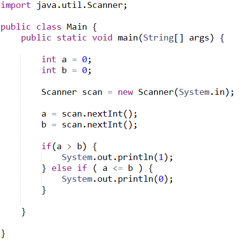 b가 a보다 크거나 같으면 1을, 그렇지 않으면 0을 출력하는 프로그램을 작성해보자.