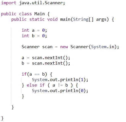 a와 b가 같으면 1을, 같지 않으면 0을 출력하는 프로그램을 작성해보자.