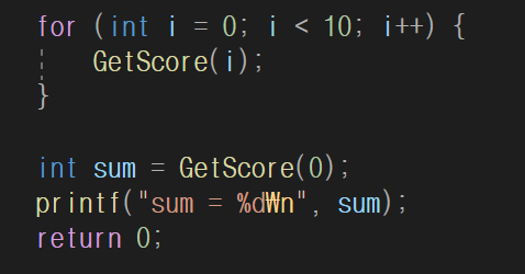 그리고 메인 함수에서 GetScore이라는 함수를 호출하고 실행을 하면, for 반복문을 이용하여 매개변수값에